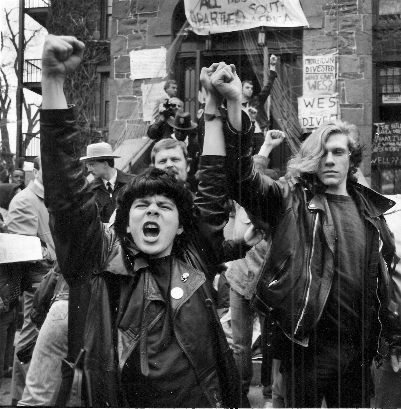 Then came my political arrests, the first one in my freshman year in college to help bring down apartheid in South Africa. I was wearing a button that read “Militant Homosexual” when it happened (although you can’t make that out in the picture), and a hairstyle that looked a lot like Joey Ramone’s (R.I.P. Joey!). Yes, it seems crazy that apartheid was still going on when I went to college, but it was, and we were blocking off one of the admin. buildings to pressure my university into divesting their funds from apartheid practicing South Africa. http://www.nytimes.com/1988/05/03/nyregion/110-protesters-to-face-charges-at-wesleyan-u.html